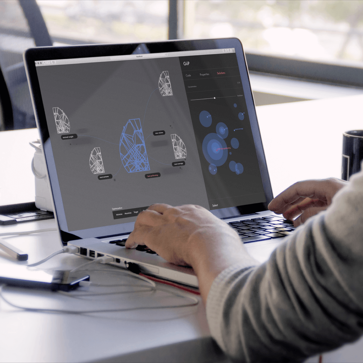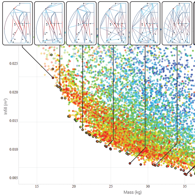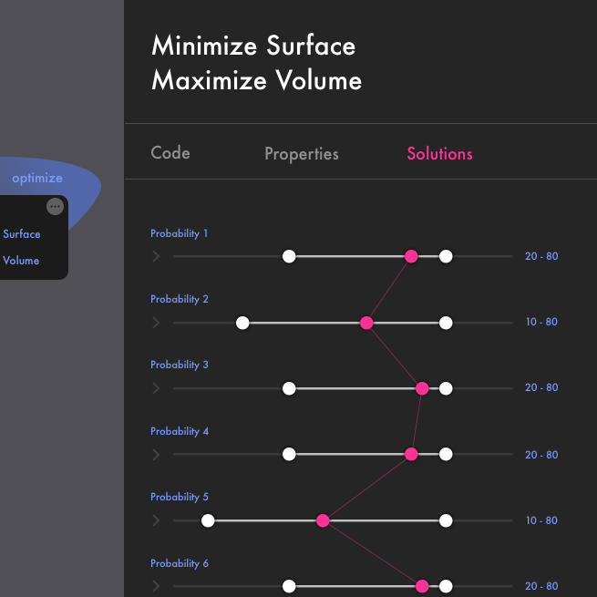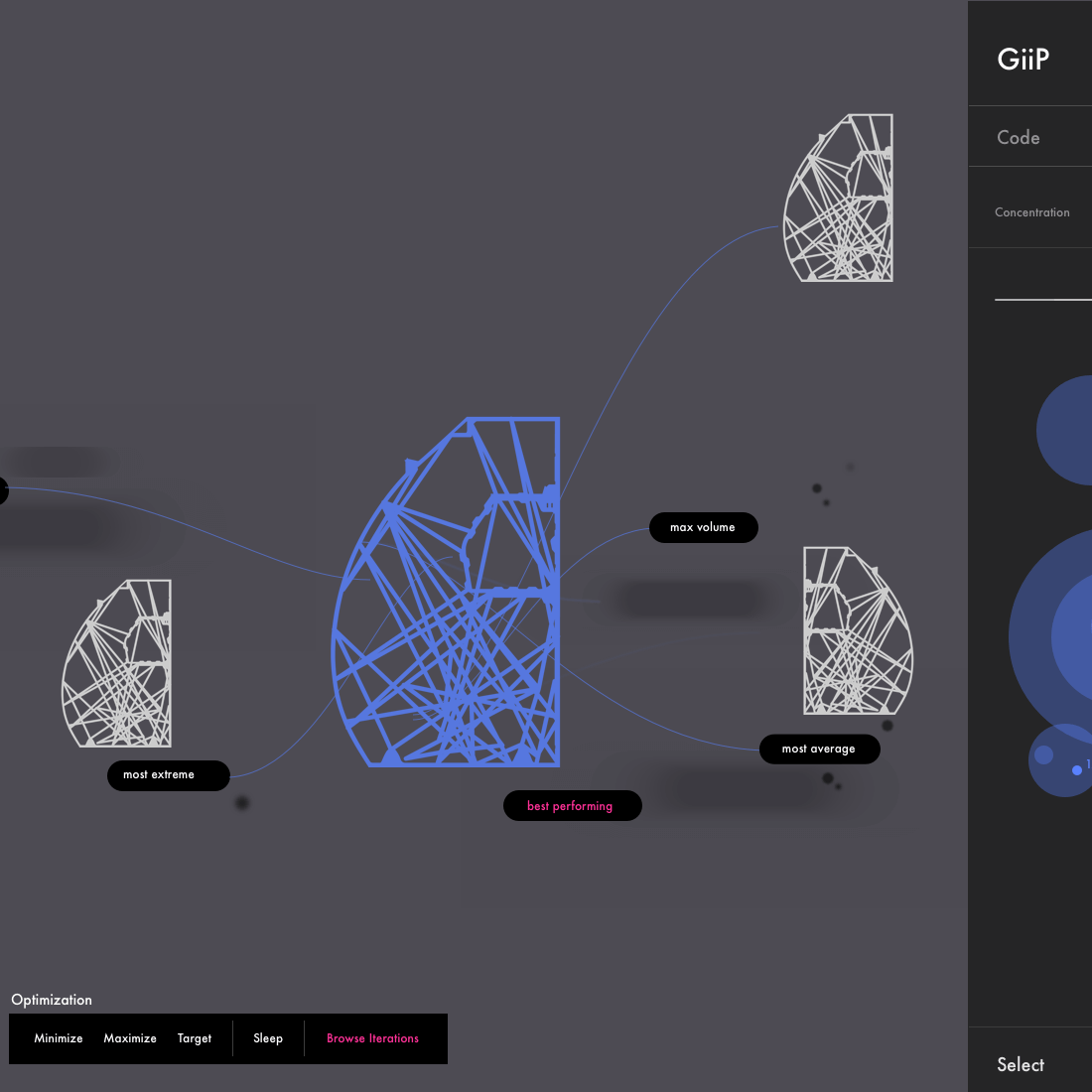 A visual programming environment that allows users to sketch design goals. The environment generates hundreds of possible solutions, trying to match the goals using algorithms simulating natural phenomenons like bacteria, or bone growth. The engineer then selects possible solutions educating the system in his preferences. The AI learns from the user and generates the next generation of solutions, getting closer to a final outcome.