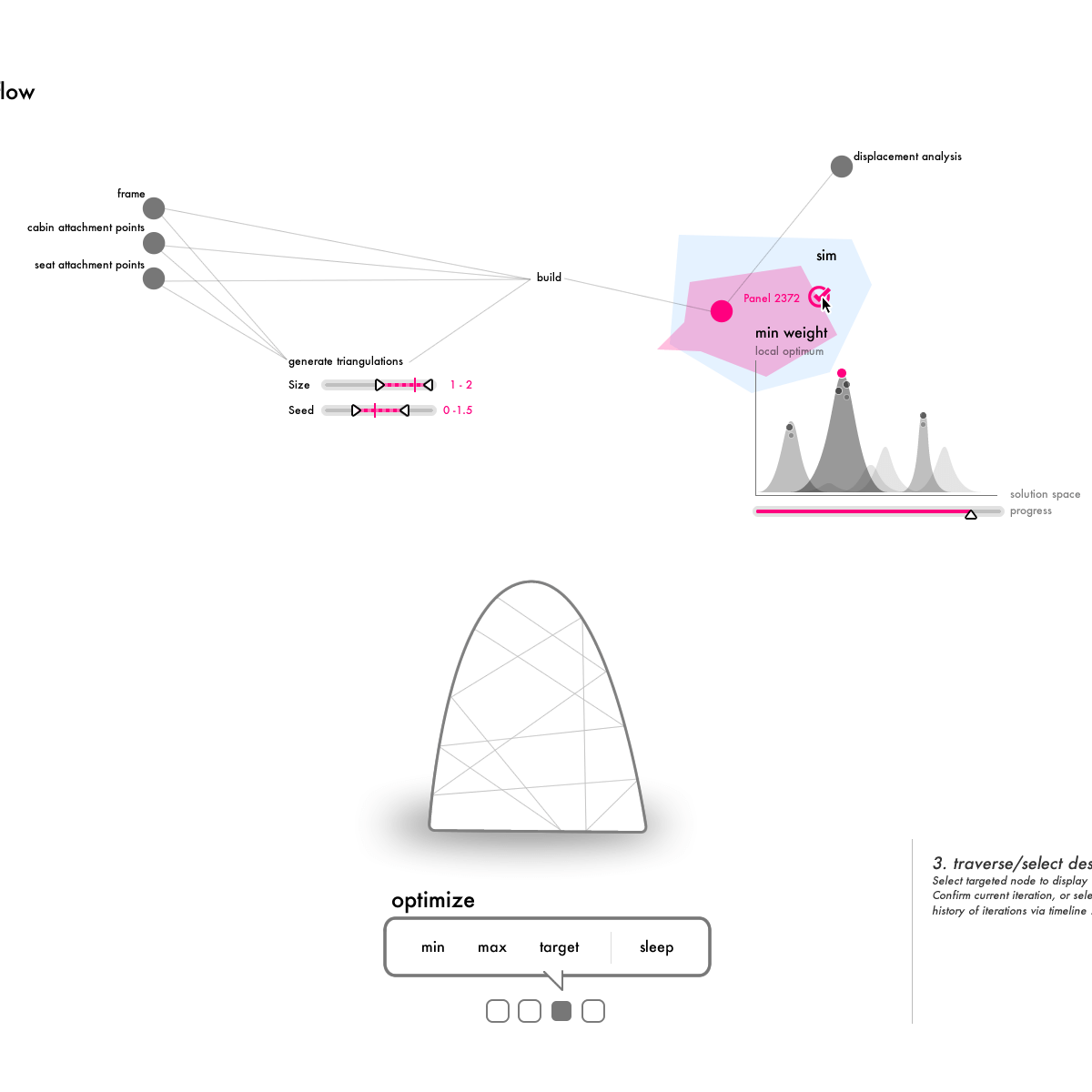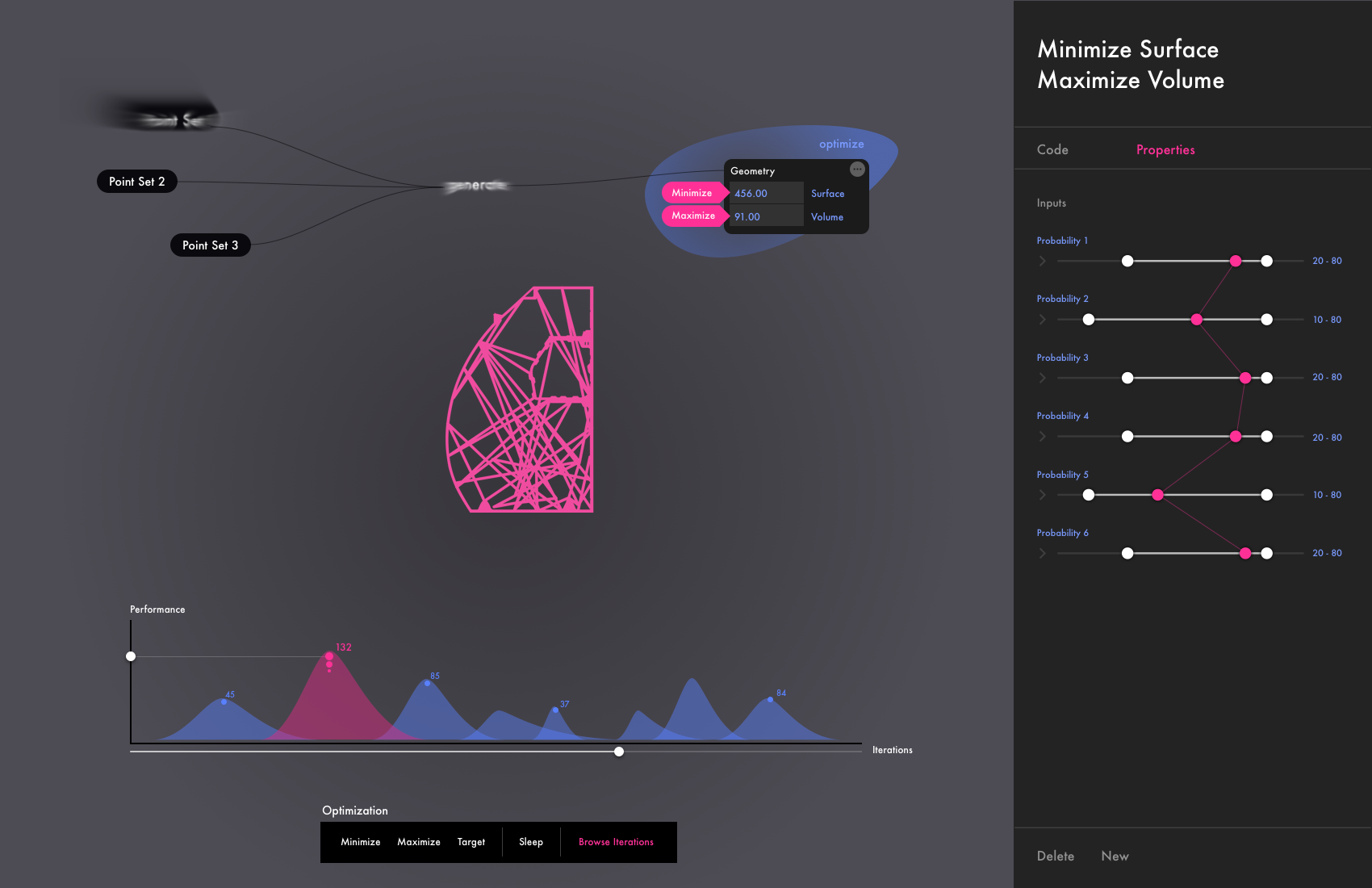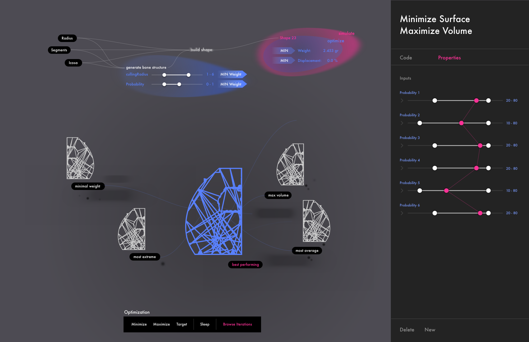 A visual programming environment that allows users to sketch design goals. The environment generates hundreds of possible solutions, trying to match the goals using algorithms simulating natural phenomenons like bacteria, or bone growth. The engineer then selects possible solutions educating the system in his preferences. The AI learns from the user and generates the next generation of solutions, getting closer to a final outcome.